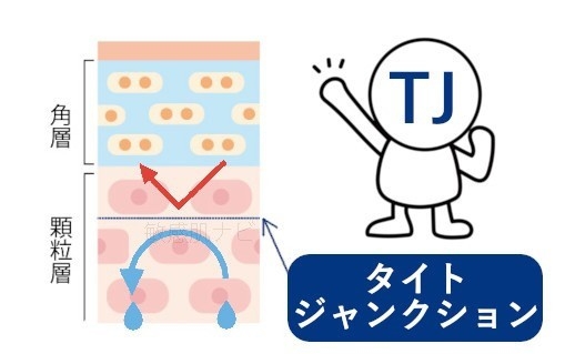 タイトジャンクション(TJ)とは、角層の下の顆粒層にあり、隣接する細胞の隙間を埋める細胞接着装置です。