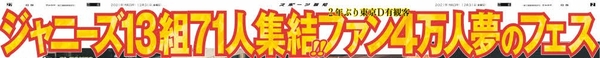 ジャニーズ事務所所属のアイドルが集った「Johnny’s Festival ~Thank you 2021 Hello 2022~」が12月30日に開催されました。13組総勢71人が集結し、2年ぶりとなる東京ドームでの有観客ライブ。スポーツ報知ではその模様を12月31日(金)発売の紙面で見開きの大展開。新聞ならではの大きさ、迫力でお届けします。