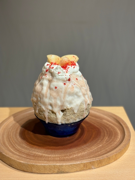 アールグレイミルクシロップに、とろとろピーチソース、レアチーズクリームやラム風味の生クリームで大人感をアップしたかき氷。