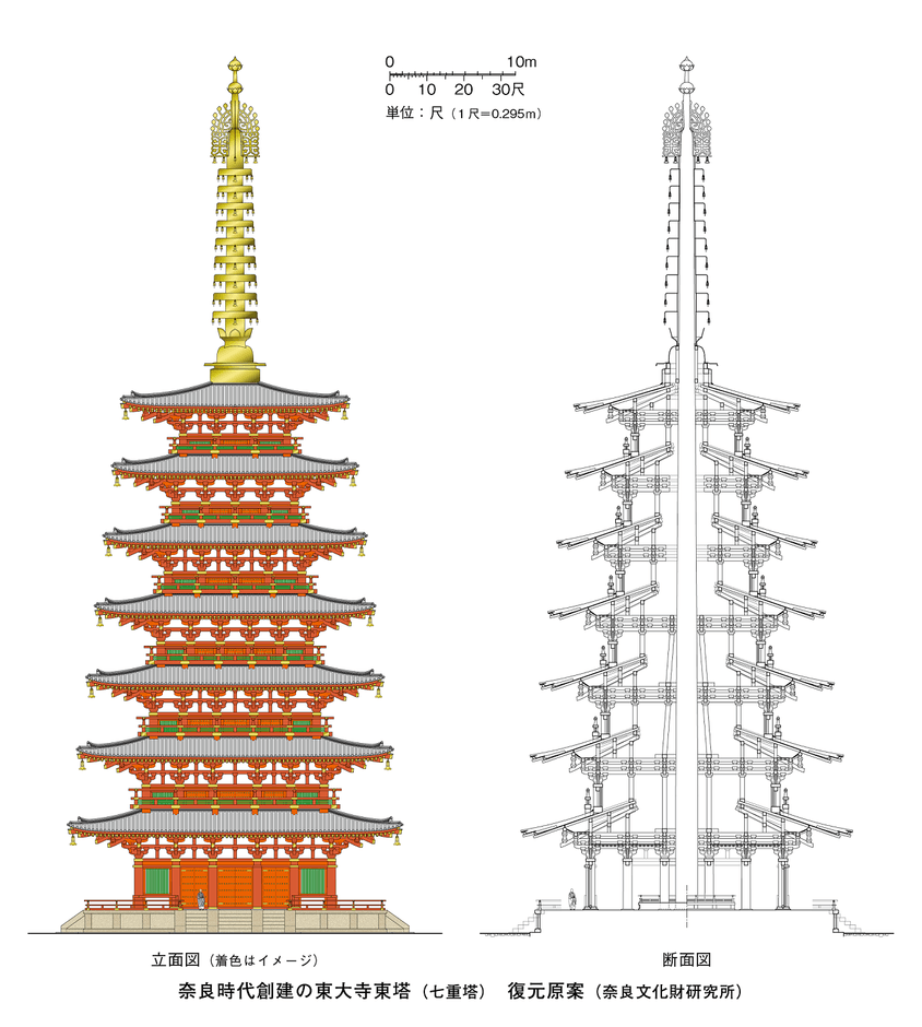 奈文研は、宗教法人東大寺から委託を受け、平成30年(2018)から東大寺東塔(七重塔)の復元研究をおこなってきました。特に、奈良時代創建の東塔について、初重方5間(一辺約15m)、七重塔、本瓦葺で、相輪を含む高さが230.8尺(約68m)となる復元案を導きました。