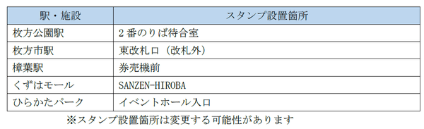 【ラリーポイント】枚方公園、枚方市、樟葉の各駅とくずはモール内SANZEN-HIROBAおよびひらかたパークイベントホール入口の計5カ所