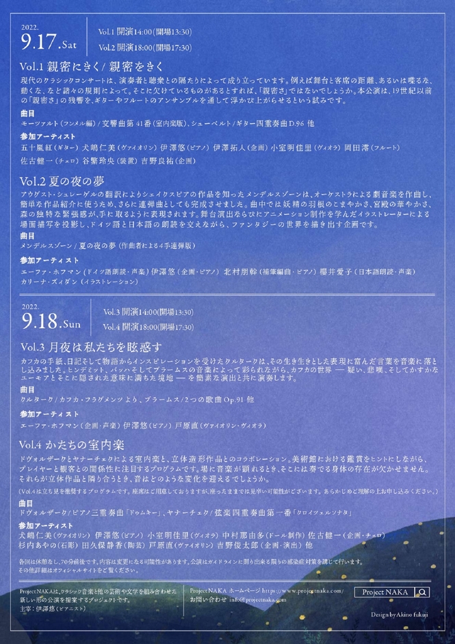Project NAKA は、他分野とのコラボレーションにより、クラシック音楽の可能性の大きさを 探る試みです。まずはクラシック音楽が外へと開き、そのなかに様々な芸術を迎え入れることで、より深く作品のなか側を知ってほしい。そこに私たちの生活と確かに結びつくものを発見できるかもしれません。