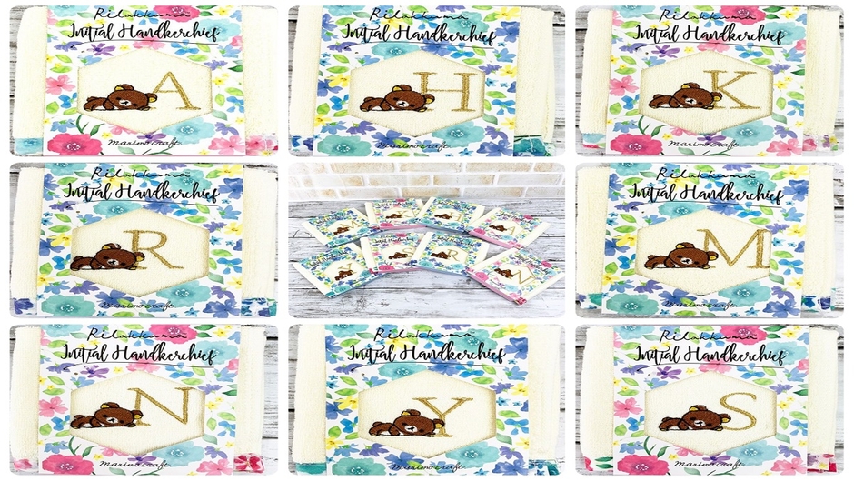 だらんとしたリラックマの刺繍がかわいい、花柄イニシャルハンドタオルのご紹介です。