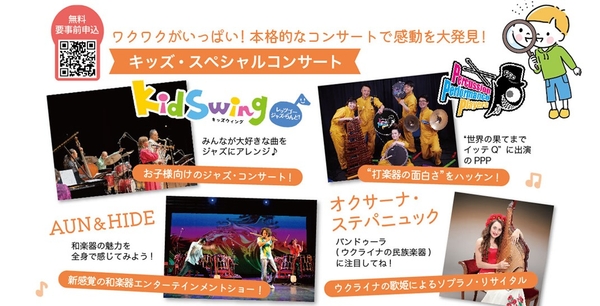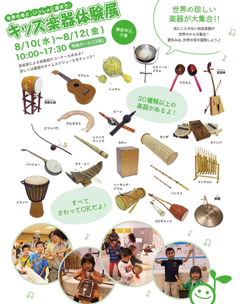 本イベントは、終日、自由に世界の国々の民族楽器を自由に触り、音を鳴らせる「キッズ楽器体験展」や幼児から大人まで楽しめる「キッズ・スペシャルコンサート」(要事前申込)など、夏休みに親子で楽しめる企画が盛り沢山です。