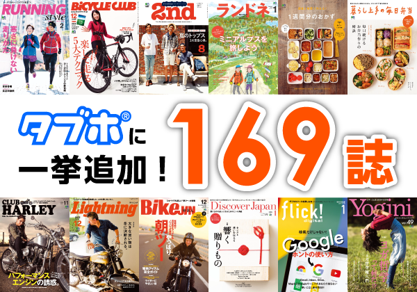 人気雑誌読み放題サービス「タブホ」へのコンテンツ提供について エイ出版社と業務提携を行い、提供コンテンツを大幅強化 硬派なスポーツバイク専門誌「BiCYCLE CLUB」や 自分らしい山の楽しみを探す人に向けた月刊誌「ランドネ」など、 趣味の雑誌から実用書まで合計169誌を追加し、 国内最大数400誌1,000冊以上に到達!
