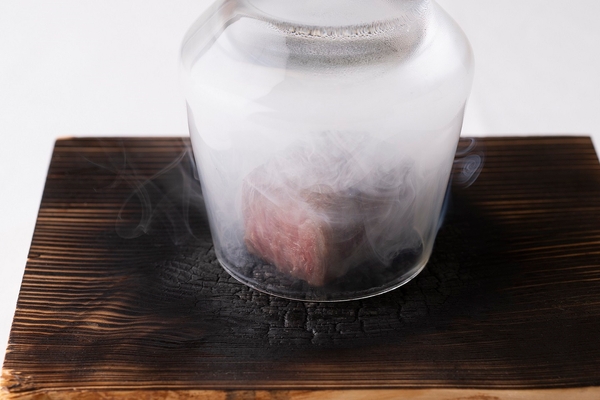 秋田牛は仕上げに秋田杉の板を火であぶり、煙と香りを立たせ、牛肉に秋田杉の香りをまとわせて提供。横に添えたベアルネーズソースと好相性です。
