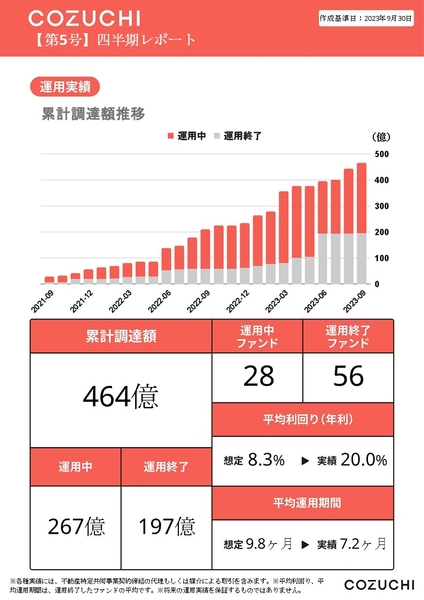 「COZUCHI」はサービス開始以降、総ファンド数84件/累計応募額約1,349億円/累計調達額約464億円の実績があり、これまで正常償還率100%(※)を維持しているなど、着実に投資家様の資産を運用してきた実績があります。(2023年9月末時点)