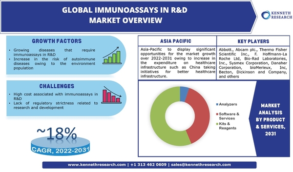 リサーチ・ネスターの一部門であるケネス・リサーチは最近、「R&D市場におけるイムノアッセイ:グローバル需要分析と機会展望2031」と題する調査レポートを発表し、R&D市場における世界のイムノアッセイの詳細な概要を、アプリケーション別、最終用途別、製品およびサービス別、および地域別の市場セグメンテーションの観点から提供しました。