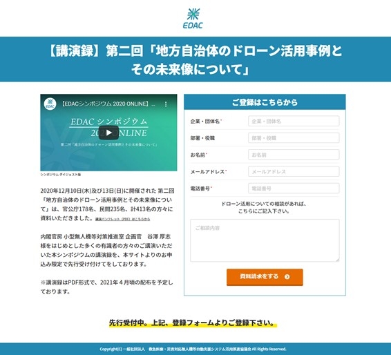 一般社団法人 救急医療・災害対応無人機等自動支援システム活用推進協議会(所在地:東京都千代田区、理事長:稲田 悠樹、以下 EDAC[イーダック])が主催する、EDACシンポジウム 2020 ONLINE 第二回「地方自治体のドローン活用事例とその未来像について」の講演録配布の受付専用サイトを公開、事前受付を開始いたしました。