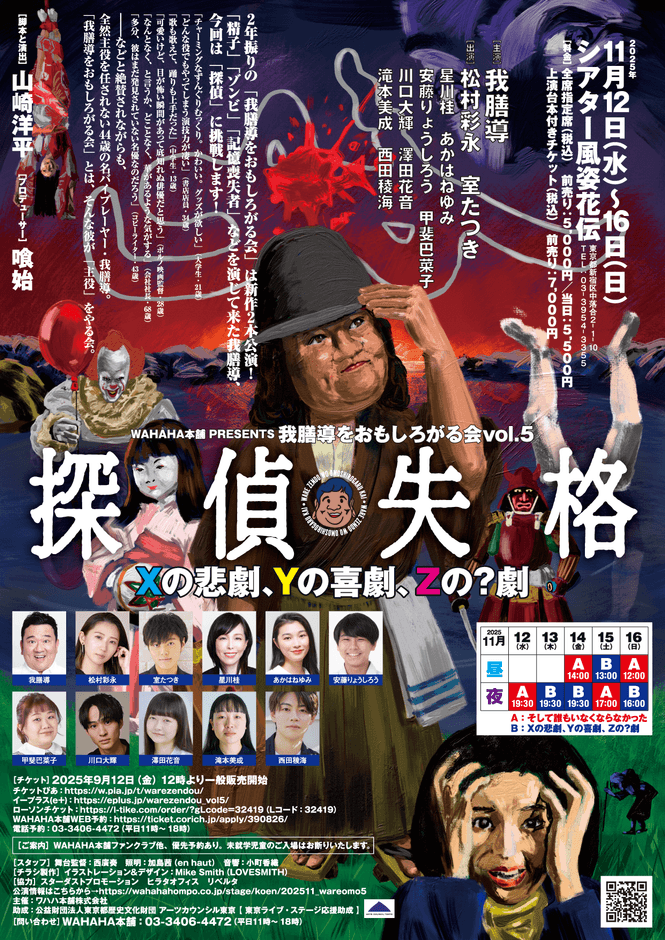 WAHAHA本舗株式会社主催、我膳導をおもしろがる会vol.5『探偵失格』<そして誰もいなくならなかった> /< Xの悲劇、Yの喜劇、Zの?劇>が2025年11月12日 (水) 〜 2025年11月16日 (日)にシアター風姿花伝(東京都 新宿区 中落合 2-1-10)にて上演されます。 チケットはカンフェティ(運営:ロングランプランニング株式会社、東京都新宿区、代表取締役:榑松 大剛)にて発売中です。