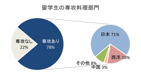 学校によって、料理部門を専攻しないところもありますが、専攻ありの留学生のうち、日本料理を専攻した学生が7割を占める結果となりました。