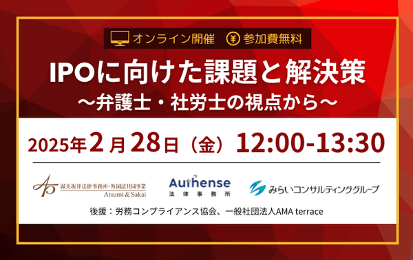 みらいコンサルティンググループ(本社:東京都中央区、代表:久保 光雄 岡田 烈司)は、2025年2月28日にセミナー『IPOに向けた課題と解決策〜弁護士・社労士の視点から〜』をWEBにて開催します。