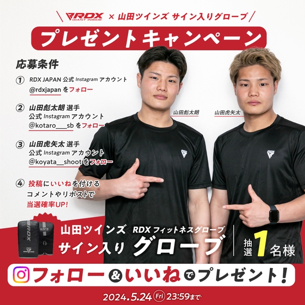 キャンペーンは、Instagramにて開催します。Cycleが運営する「RDX® SPORTS」の公式Instagramアカウント及び山田彪太朗・山田虎矢太 選手のアカウントのフォローし、かつキャンペーン投稿を「いいね」するだけで参加できます。抽選で両選手サイン入りRDXフィットネスグローブ(マットシルバー フリーサイズ)をプレゼントします。すでにアカウントをフォローしている方は「いいね」のタップのみで応募することができます。期間は2024年5月14日(火)~5月24日(金)23:59まで。当選者の発表は当社アカウントから、DMにてお知らせします。
