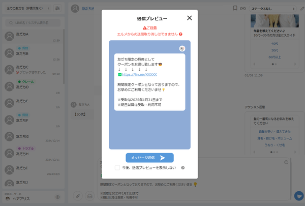 メッセージ送信前に表示確認ができるようになったことで、誤送信を防止します。