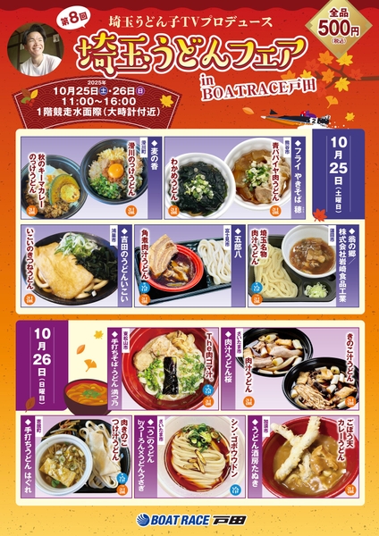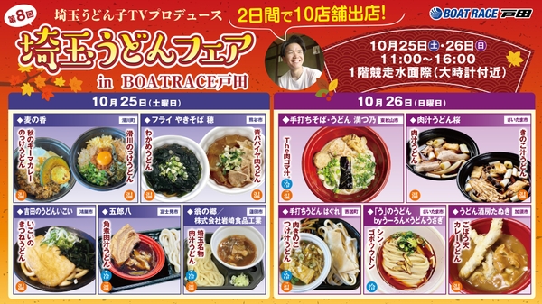 また、第4回漫画アクションカップ開催中の10月25日(土)と26日(日)の2日間は、BOAT RACE戸田ではすでに恒例行事となった人気イベント『第8回埼玉うどんフェア』も実施される。