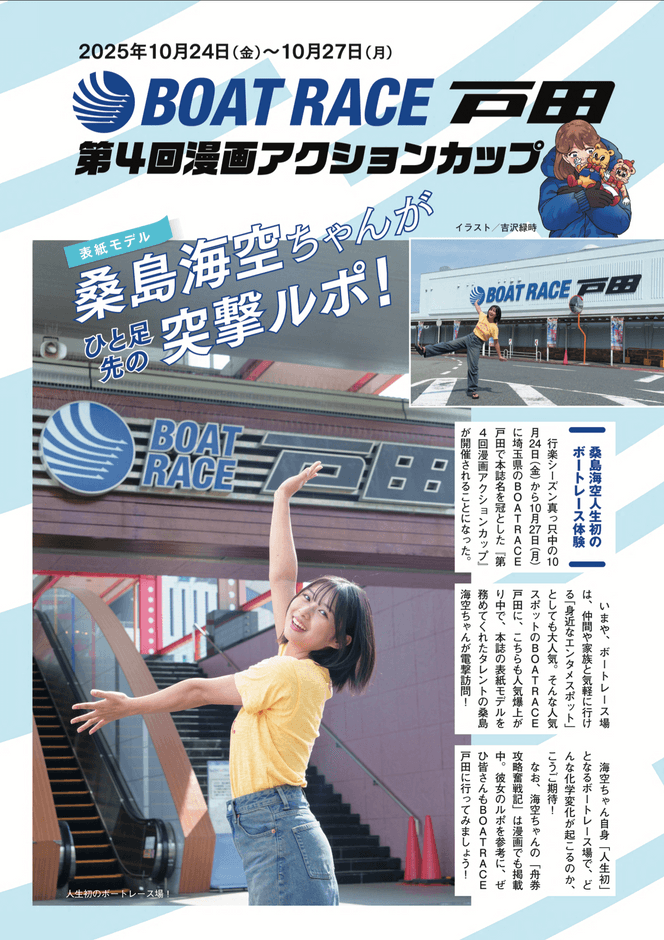 これに合わせて、10月21日発売の『漫画アクション』では、表紙タレントを務めた人気タレントの桑島海空さんがBOAT RACE戸田をルポした特別企画を展開。桑島さん自身「ボートレース場を訪れるのは初めて」ということで、誌面では彼女の初々しい姿をグラビアと漫画で存分に楽しむことができる。