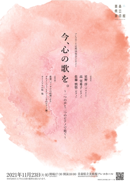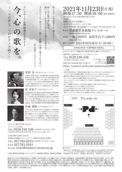 青森県立美術館パフォーミングアーツ推進実行委員会主催による、アレコホール定期演奏会2021「今、心の歌を。」~一つの声と二つのピアノで紡ぐ~が2021年11月23日(火・祝)に青森県立美術館アレコホール(青森県青森市)にて開催されます。チケットはカンフェティ(運営:ロングランプランニング株式会社、東京都新宿区、代表取締役:榑松 ⼤剛)にて10⽉18⽇(月)より発売開始です。
