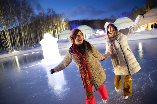 アイスヴィレッジの入り口には街全体を見渡せる展望台があります。そこから街へと滑り降りていく氷の滑り台、その先にはアイスリンクが広がります。どちらも子どもから大人まで楽しめる人気のアクティビティです。自然の寒さが作り上げたアイスリンクでは、幻想的な景色を眺めながらスケートを楽しめます。スケート靴は貸し出しを行っているので誰でも気軽に体験できます。