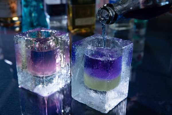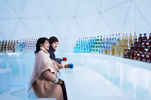 氷のバーカウンター、セラーを設え、本格的にお酒をたしなむバーです。50種類以上のメニューを氷のグラスで提供します。今年は、青色のカクテルとレモンの酸が混ざり合ってピンク色に変化する「レモン氷カクテル」が新しく登場します。レモンのさわやかな香りとスッキリとした味わいが特徴です。幻想的な景色を眺めながら透き通った氷のグラスで飲むカクテルは格別です。
