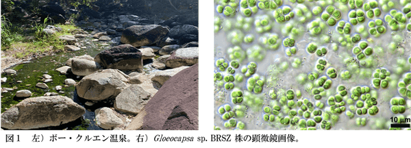 本研究では、タイのラーチャブリー県にあるボー・クルエン温泉から単離したシアノバクテリア Gloeocapsa sp. BRSZ 株(図1)から、新規のマイコスポリン様アミノ酸(MAA)である GlcHMS326 を発見しました。GlcHMS326は、シアノバクテリア由来MAAとしてこれまでに報告のない「グリコシル化・ヒドロキシ化・メチル化」という三重の化学修飾を持つMAAです(図2)。