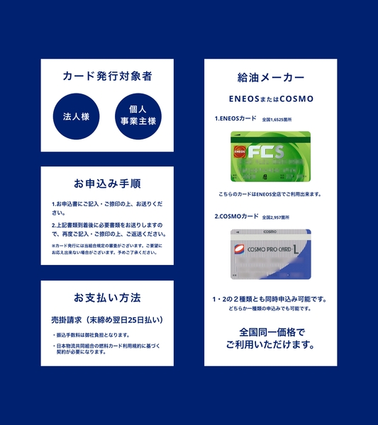 全国20,000カ所のスタンドで可能!中小企業・個人事業主に強い味方《カード代月額無料》ENEOS・COSMO【ガソリン・軽油】法人売掛カードのご案内