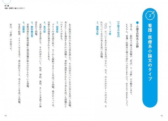 本書では、小論文の“書き方”のスキルだけでなく、まず、看護・医療系小論文の「土台」となる、「現代医療の背景知識」などから解説し、医療現場の基本を踏まえることからスタート。そこから、小論文でやってしまいがちな失敗、評価される小論文を書くコツなどをやさしく伝えていきます。