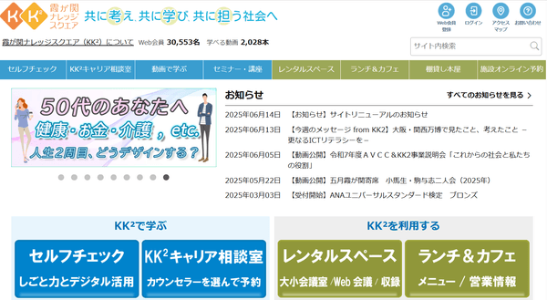 KK²では、今回リニューアルしたWebサイトを活かし、地域や世代を越えて学びの場を広げる「デジタル公⺠館」としての役割を担ってまいります。