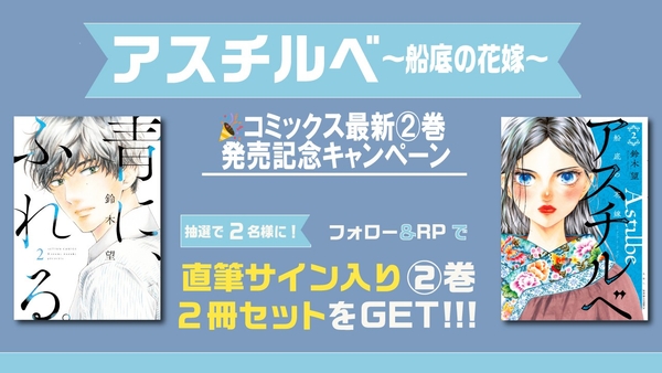 鈴木望双葉社公式アカウント(@suzukinozomi_f)にて、『アスチルベ~船底の花嫁~』と『青に、ふれる。』の2巻イラスト入り直筆サイン本を2冊セットで抽選2名様にプレゼント! 公式アカウントをフォローのうえ、キャンペーンポストをRPすれば応募完了です。
