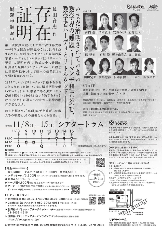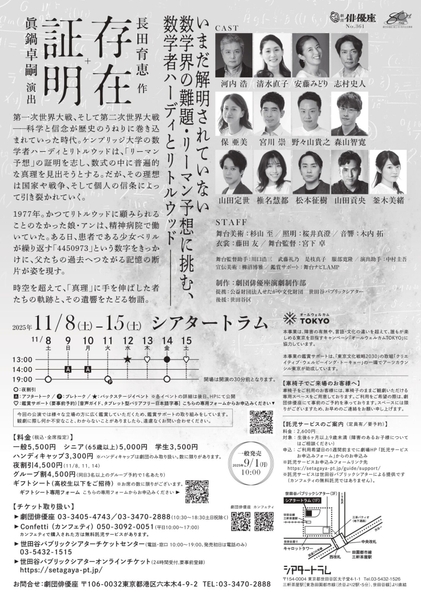 劇団俳優座主催、本公演 No.361『存在証明』が2025年11月8日 (土) 〜 2025年11月15日 (土)にシアタートラム(東京都 世田谷区 太子堂 4丁目1番地1号)にて上演されます。 チケットはカンフェティ(運営:ロングランプランニング株式会社、東京都新宿区、代表取締役:榑松 大剛)にて発売中です。