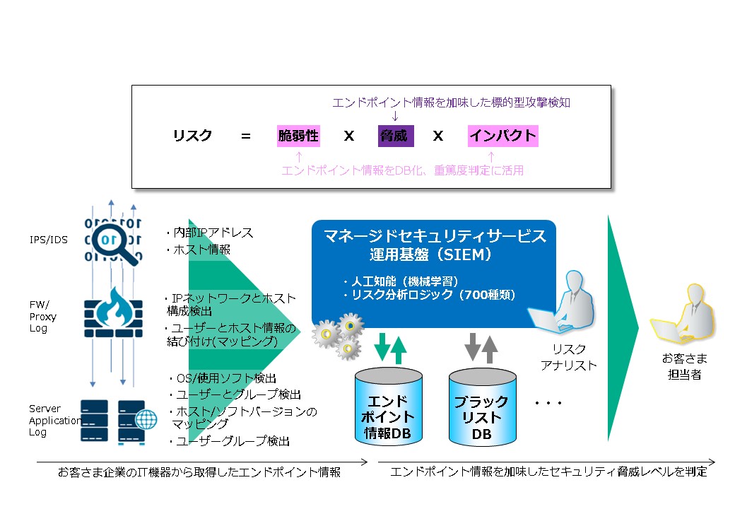 NTTコミュニケーションズ株式会社(略称:NTT Com)は、2016年2月10日より、総合リスクマネジメントサービス「WideAngle」のマネージドセキュリティサービス運用基盤(SIEM)において、お客さま企業のIPS/IDS/FW/ProxyサーバーなどのIT機器から取得したエンドポイント情報を活用し、セキュリティ脅威レベルを自動判定する機能、および情報漏洩の重篤度に応じた最適なセキュリティ対策を迅速に情報連携する機能を独自に開発・実装し、企業ICT環境へのサイバー攻撃に対する人工知能(機械学習)の検知・分析力を大幅に強化します。