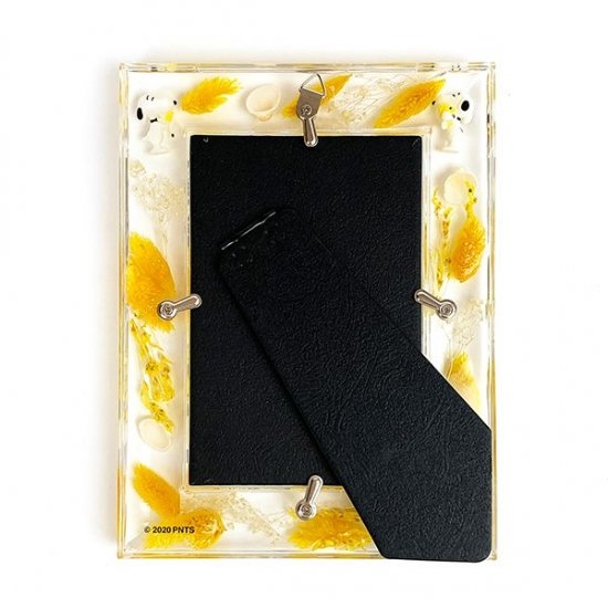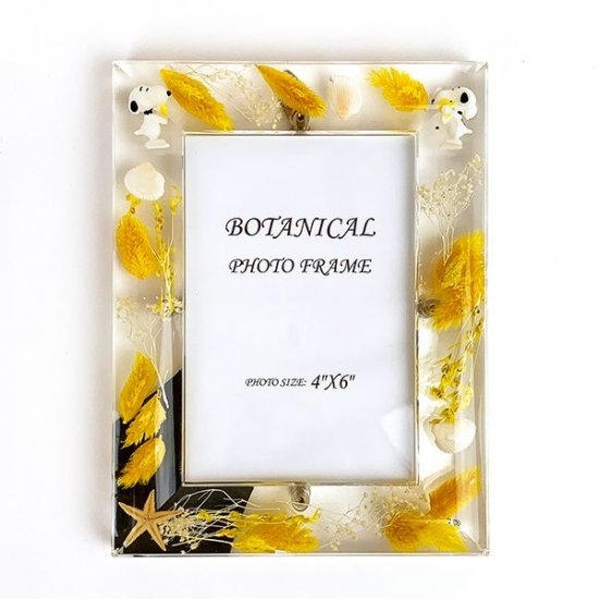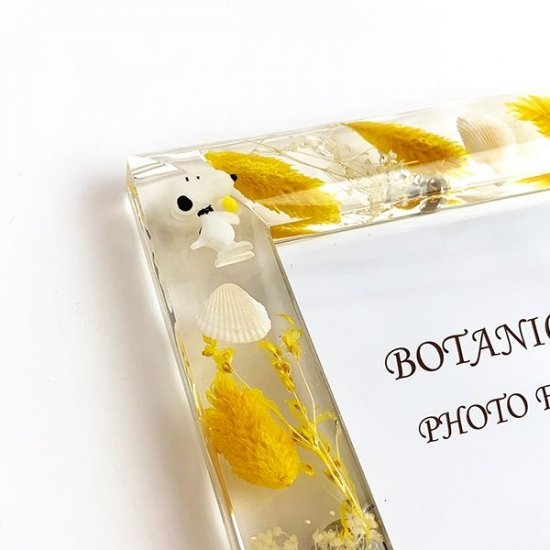 こちらは、フォトフレームです。写真を飾るスペースの周りに、ハーブやシェルなどが飾られています。上部の両端には、スヌーピーのフィギュアも♪