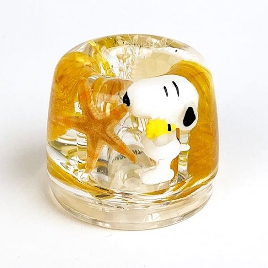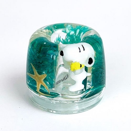 グリーンを基調とした植物やヒトデやシェルなどのレリーフが閉じ込められた、ハーバリウムのようなスタンドです。中にはちゃんとスヌーピーのフィギュアも♡