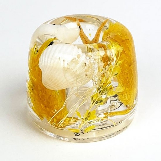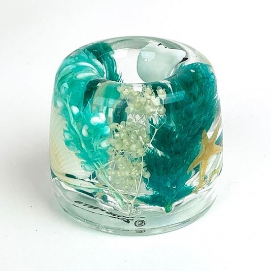 アクリル樹脂で閉じ込められたグリーンやホワイトのナチュラルなレリーフたち。インテリアにもなるきれいさですよね。