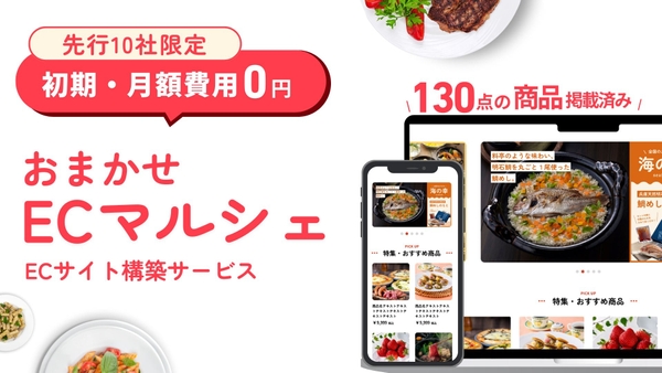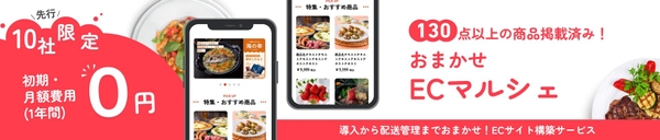 「おまかせECマルシェ」は、グルメ商品が130点以上掲載済み+自社商品も掲載できる商品ラインナップを充実させた状態でECサイトを構築できるサービスです。
