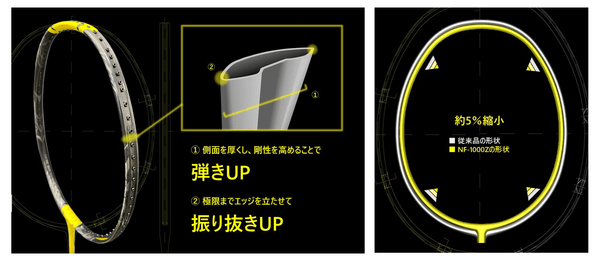 厚ラケエアロ形状とコンパクトフレームを組み合わせた、弾き向上・空気抵抗減少を突き詰めたNANOFLARE 1000 Z独自のフレーム設計。