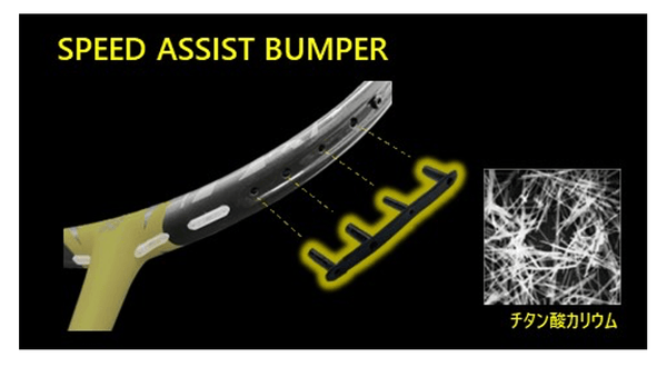 変形しにくい高剛性のチタン酸カリウムを配合した連続グロメットをフレーム下部に装着することでフレームの変形を減らし、弾き性能を向上させる。