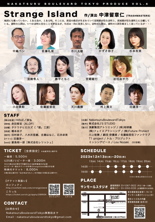 NakatsuruBoulevardTokyo(代表:田邉淳一)主催、NakatsuruBoulevardTokyo第4弾『Strange Island』が2023年12月13日 (水) ~2023年12月20日 (水)にサンモールスタジオ(東京都新宿区新宿1丁目19-10サンモール第3M-B1)にて上演されます。
