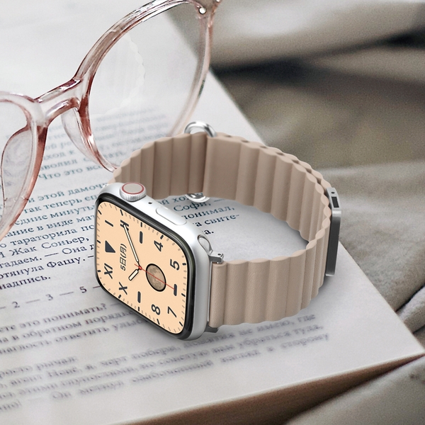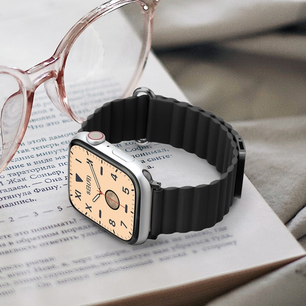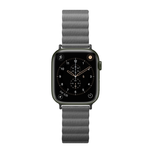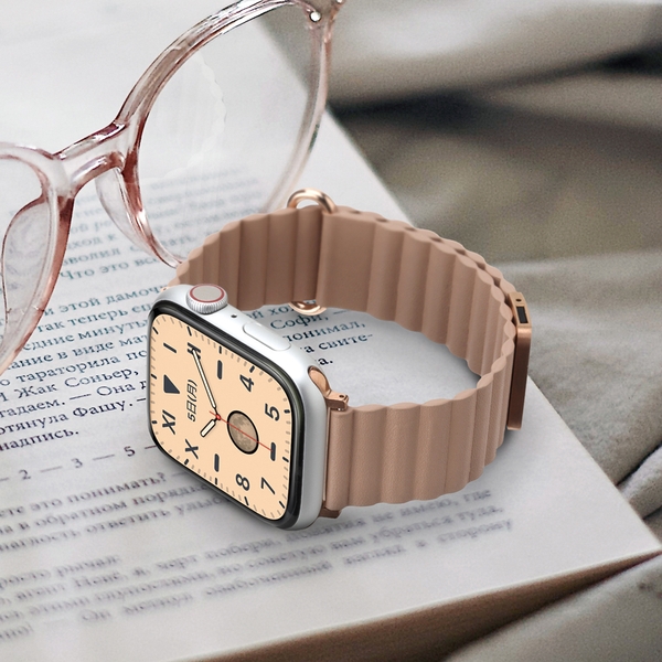 着脱・長さ調整が簡単なマグネットタイプのApple Watch 用バンドです。上品で手触りのよいPUレザー素材のバンド全面にマグネットを内蔵し、マグネット部分を重ねるだけで簡単装着・長さ調節が可能です。バックルとラグの金属部分はバンドに合わせた高級感あるカラーを採用。バンドの長さは、手首周り約135~185mmの間で調節が出来ます。