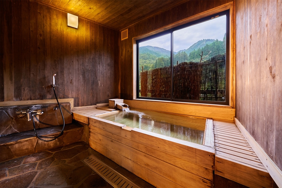 かぐわしい香りに癒やされる2つの貸切風呂では、檜風呂をお楽しみいただけます。窓の外に広がる豊かな自然と檜の温もり、温泉の流れる音に癒される、とっておきの時間をお過ごしください。
