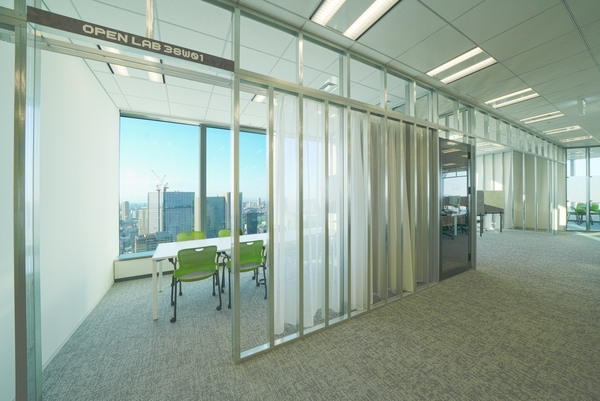 執務エリアである37F、38Fに設置されたオープンな会議室。壁を構成するために最低限必要となるLGS*組みのみで仕切られています。社員の声を聞き、ホワイトボードや本棚などアタッチメントを加えることでアップデートすることができる無限の可能性を秘めています。