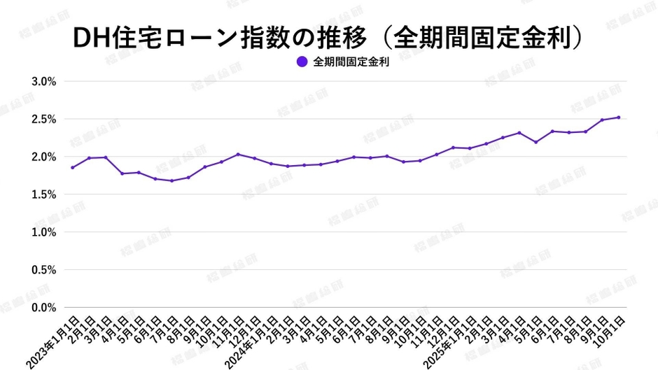 2025年10月は、DH住宅ローン指数の10年固定は1.812%と前月の1.776%と比べてわずかではありますが上昇しました。1年前の1.299%よりも上昇しているので、いまだ金利は上昇局面にあると考えています。
