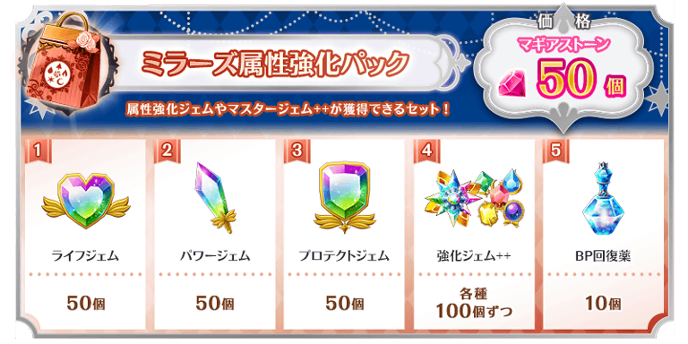 無償を含むマギアストーンで購入できる「ミラーズ属性強化パック」には以下のアイテムが封入されています。