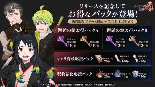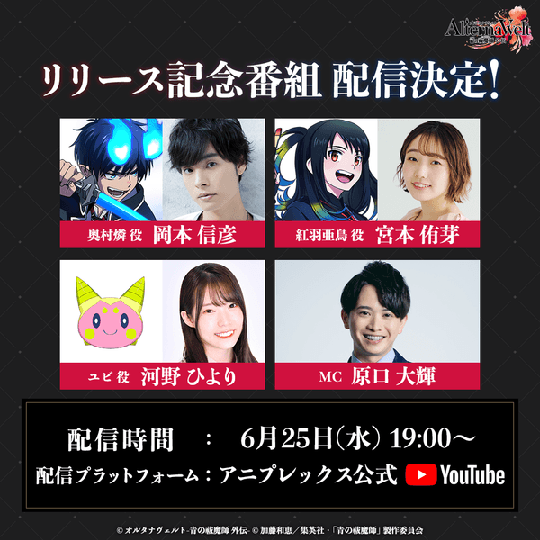 ゲーム『オルタナヴェルト -青の祓魔師 外伝-』のiOS/Android版を2025年6月25日にサービス開始いたしました。合わせてゲーム内では各種キャンペーンを実施、その他リリース記念番組の配信を行います。