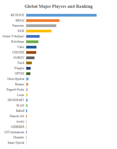 YHResearchのトップ企業研究センターによると、レーザー測距センサーの世界的な主要製造業者には、KEYENCE、HESAI、Panasonic、SICK、Ouster (Velodyne)、RoboSense、COGNEX、Valeo、OMRON、Turckなどが含まれている。2023年、世界のトップ10企業は売上の観点から約73.0%の市場シェアを持っていた。
