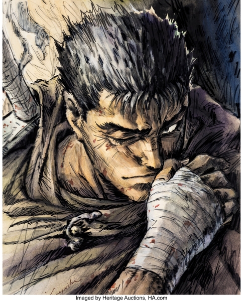 『ベルセルク』の伝説的な美術監督、小林七郎氏(1932-2022)が手がけた版権用セル画。黒い剣士・ガッツの姿が印象的に描かれている。首元に烙印を持ち、大剣を携えたガッツの迫力ある姿が、9.5×12インチのセル上に小林氏特有のスタイルで手描きされ、左下には小林氏のサインの一部も確認できる。その芸術性と希少性の高さから、『ベルセルク』関連作品の中でも、最も重要なものの一つとされている。