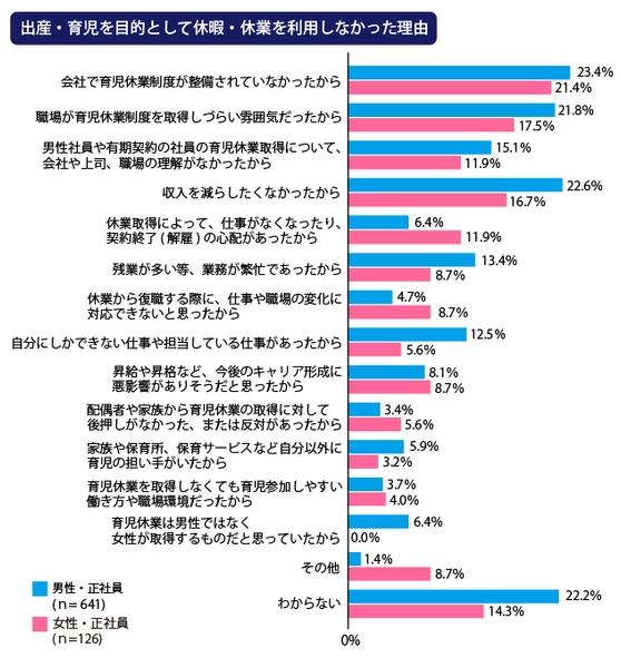 会社によってはまだまだ育休制度自体の整備がされていないことや、上司の理解が不足しているところもあります。それ以外には収入が減るなどの理由をあげている人が多いのもわかります。