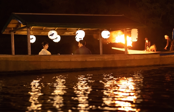 「プライベート鵜飼鑑賞舟」では、星のや京都専用の雅な屋形舟「翡翠」を1日1組限定で貸し切り、嵐山の夏の風物詩「鵜飼」をプライベートに鑑賞します。屋形舟の中では、三味線の生演奏とともに鵜飼の情景を映した弁当とシャンパーニュを味わいます。鵜飼のにぎわいとともに、夏の宵の華やかな風情を楽しむことができるアクティビティです。