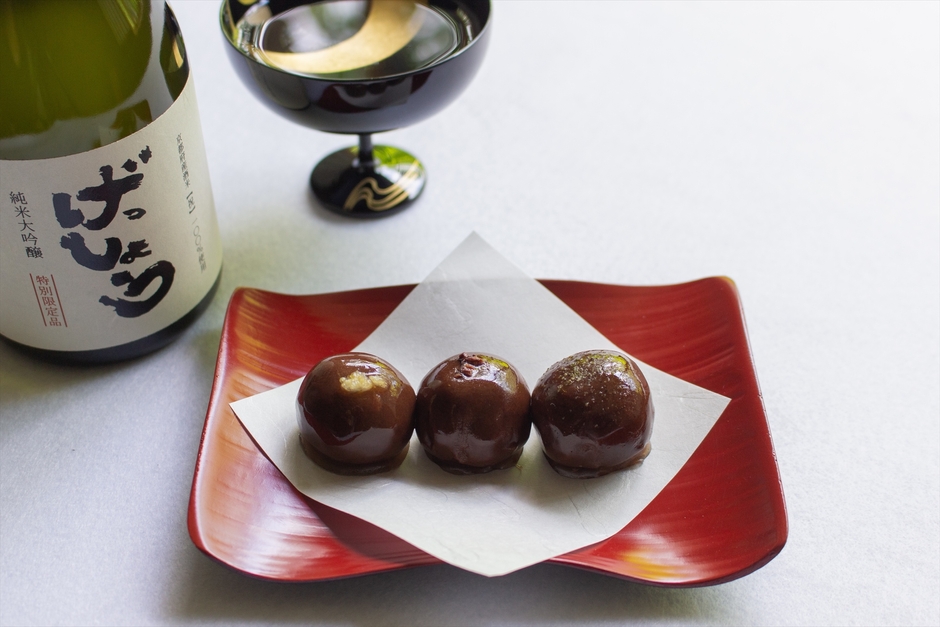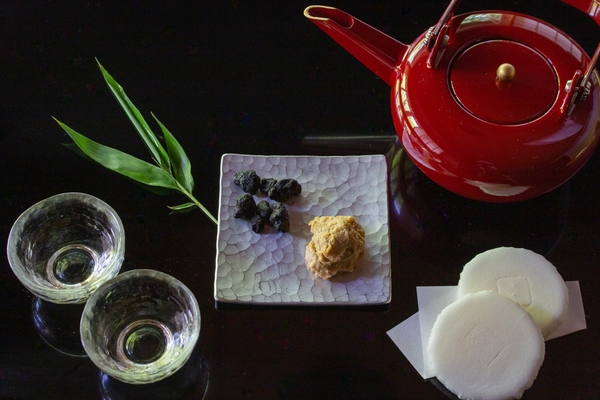 ウェルカムドリンクは、嵐山の地で栽培された酒米「祝(いわい)」を使用した、記念日にふさわしい日本酒です。お酒と一緒に味わうのは、京都で1803年に創業した京菓子司「亀屋(かめや)良(よし)長(なが)」とBean to Bar チョコレートファクトリーの「ダンデライオン・チョコレート」がコラボレーションして手掛けたウェルカムスイーツです。亀屋良長の代表銘菓「烏羽(うば)玉(たま)」にダンデライオン・チョコレートのカカオを混ぜ込み、山椒や柚子など和のフレーバーを合わせた星のや京都オリジナルの和菓子です。