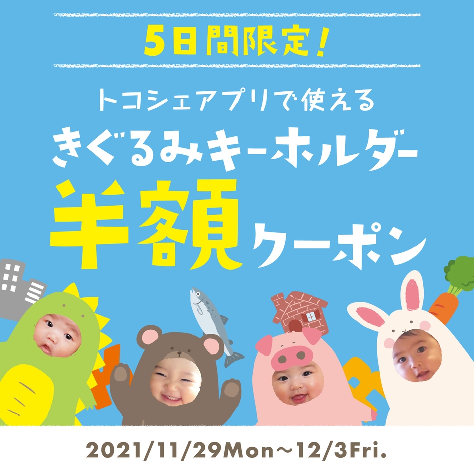 iOS版アプリリリース記念としまして、「2021/11/29(月)~12/3(金)」の5日限定できぐるみキーホルダーが半額になるお得なクーポンを配布中です。