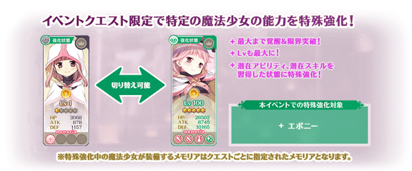 対象の魔法少女を編成して本イベントクエストをプレイする際に、ステータスを特殊な状態に強化することができます。